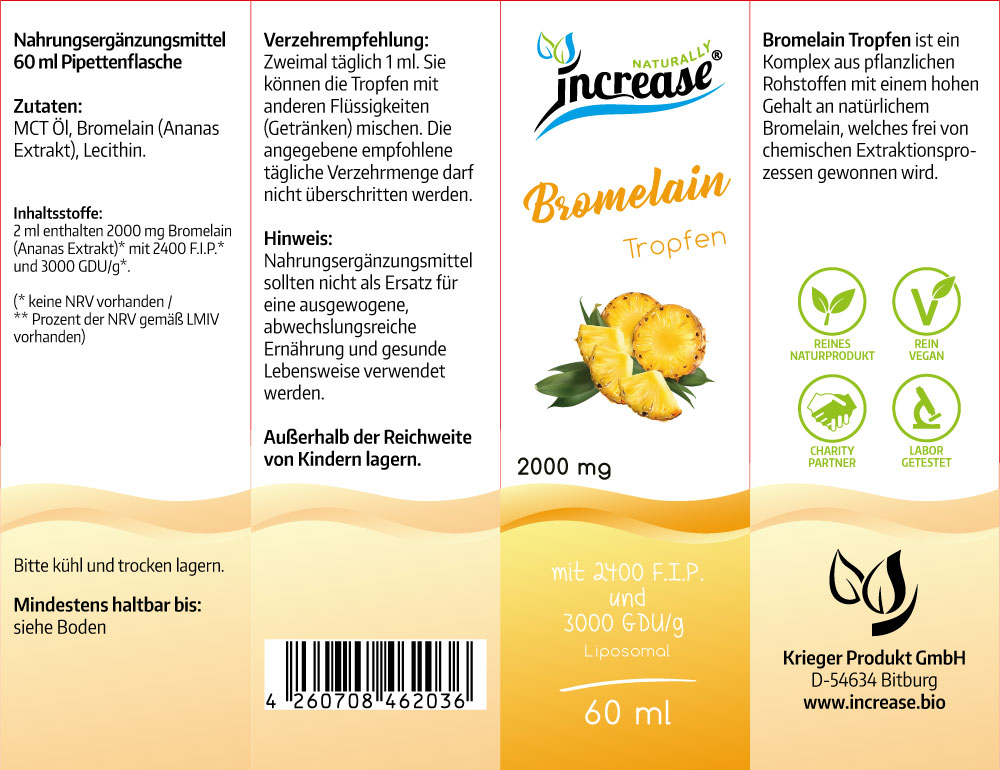 Inhaltsstoffe: 2 ml enthalten 2000 mg Bromelain (Ananas Extrakt)* mit 2400 F.I.P.* und 3000 GDU/g*. (* keine NRV vorhanden / ** Prozent der NRV gemäß LMIV vorhanden)