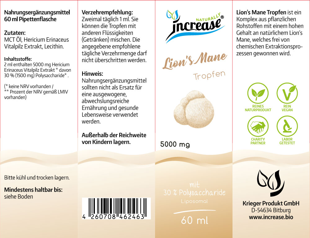 Inhaltsstoffe: 2 ml enthalten 5000 mg Hericium Erinaceus Vitalpilz Extrakt * davon 30 % (1500 mg) Polysaccharide* . (* keine NRV vorhanden / ** Prozent der NRV gemäß LMIV vorhanden)