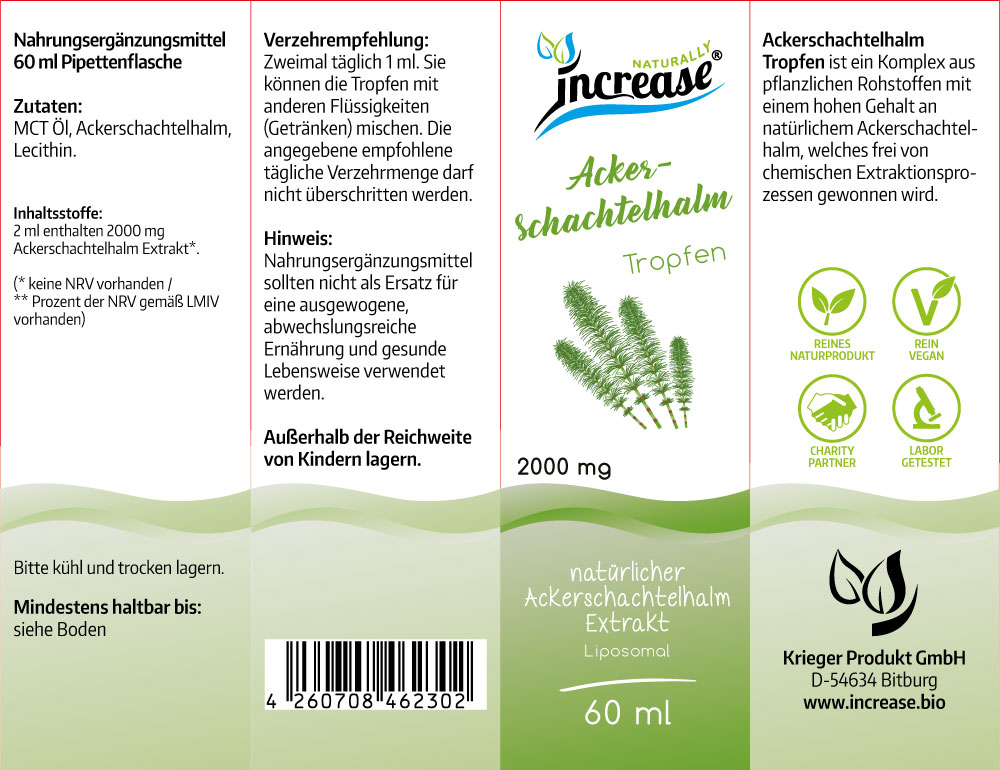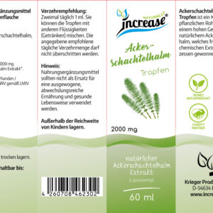 Eine Tagesdosis enthält 2000 mg natürliches Ackerschachtelhalm. Pro Flasche sind 60.000 mg Ackerschachtelhalm enthalten.