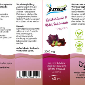 Eine Tagesdosis enthält 2000 mg natürliche Rosskastanie & Rotes Weinlaub. Pro Flasche sind 60.000 mg Rosskastanie & Rotes Weinlaub enthalten.